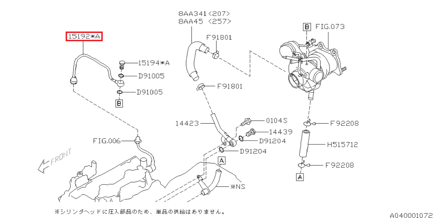 15192AA470 Subaru Turbo Oil Feed Pipe Spec C 2003 Onwards